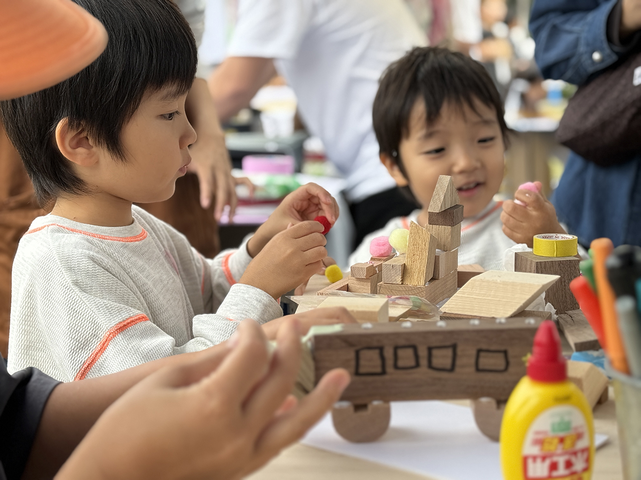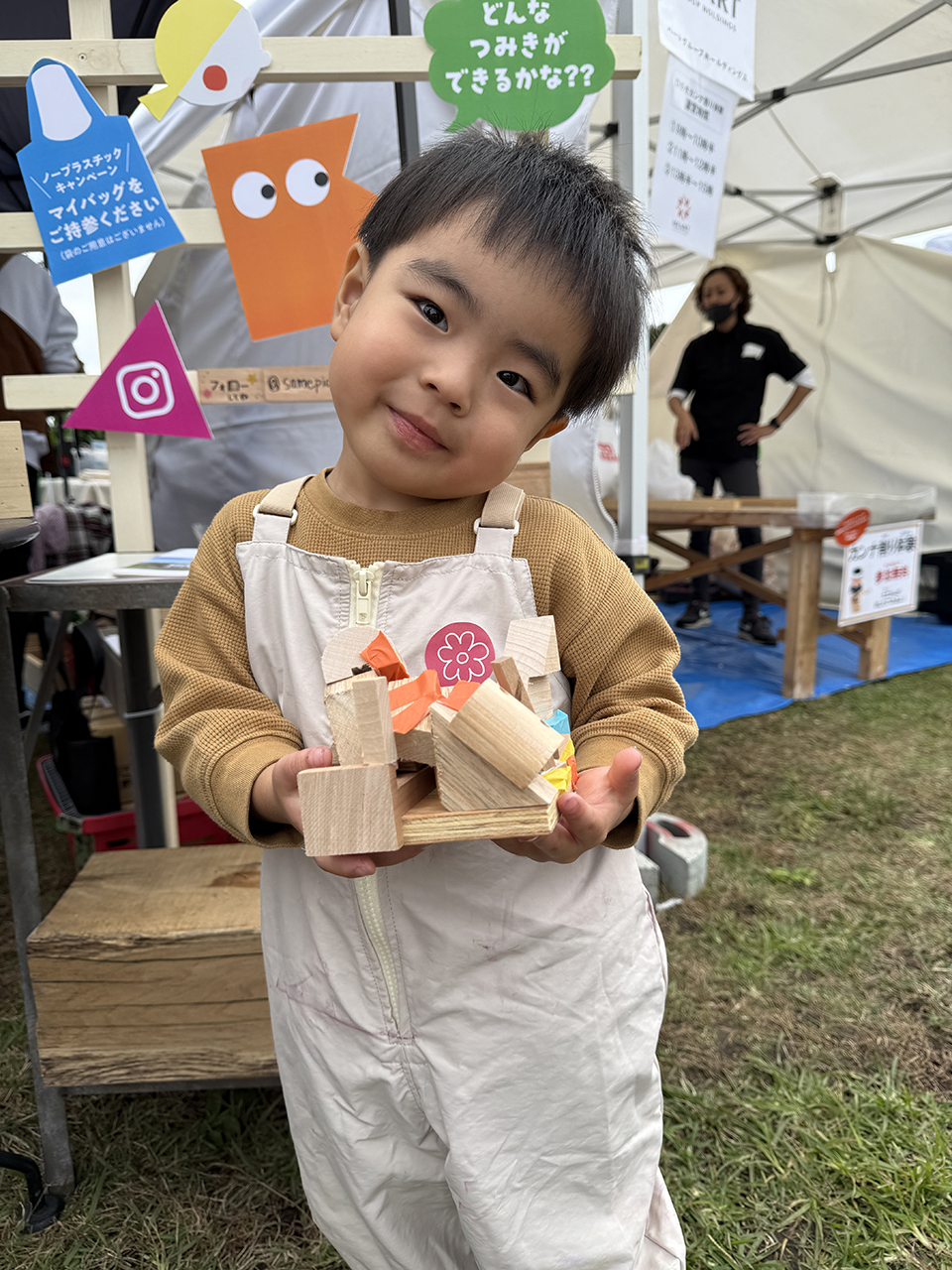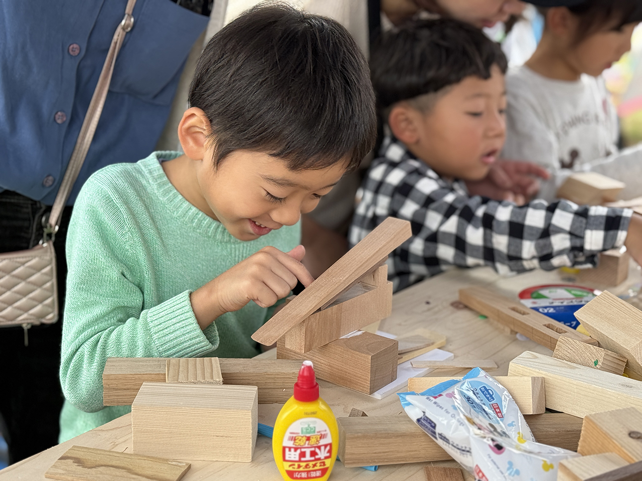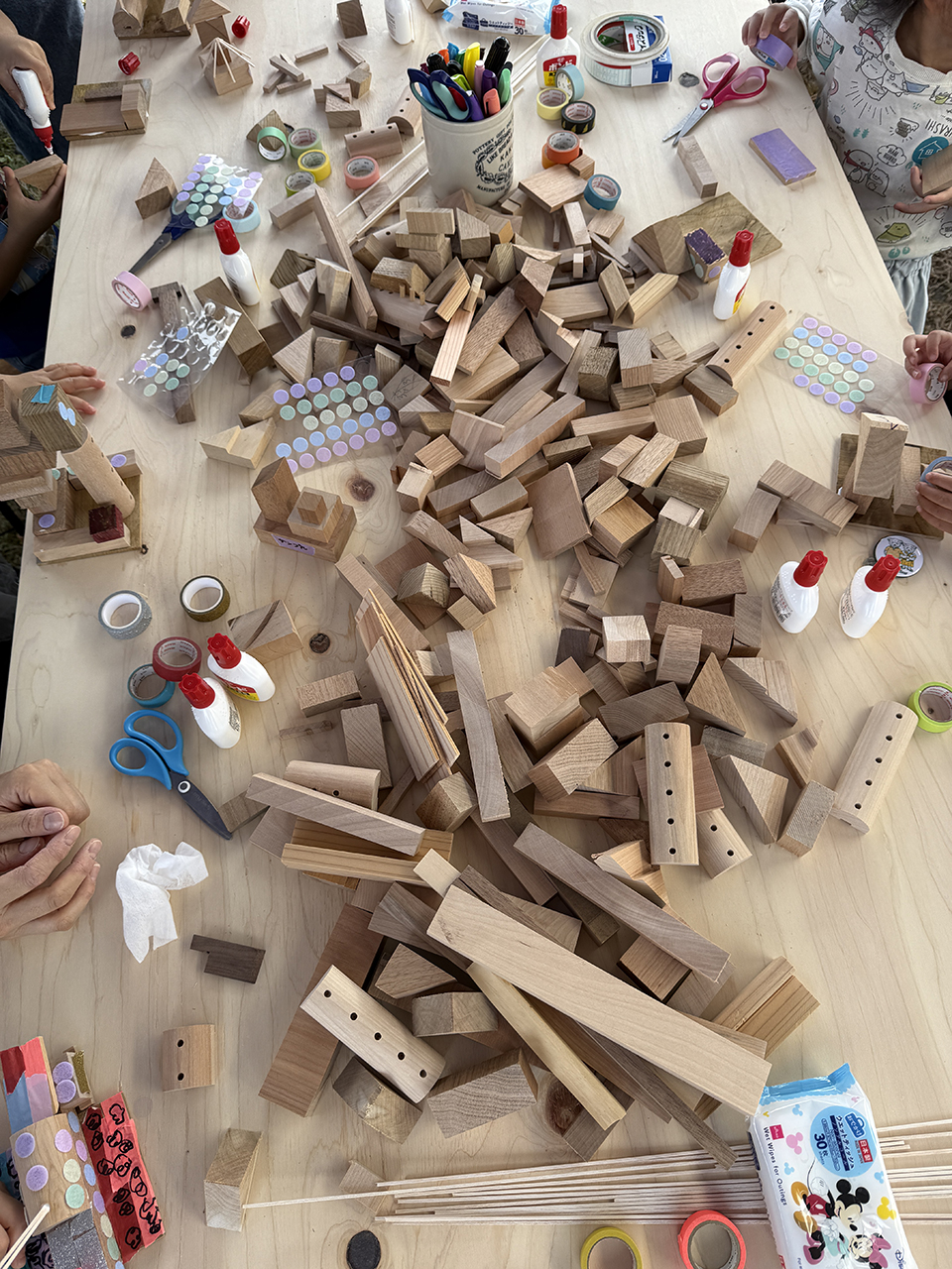 2日目もたくさんのキッズたちが参加してくれたおかげで、準備していた端材(積み木の材料)はすべて使い切り!本来なら捨てられてしまう端材が、子どもたちの手で素敵な作品へと生まれ変わりました。