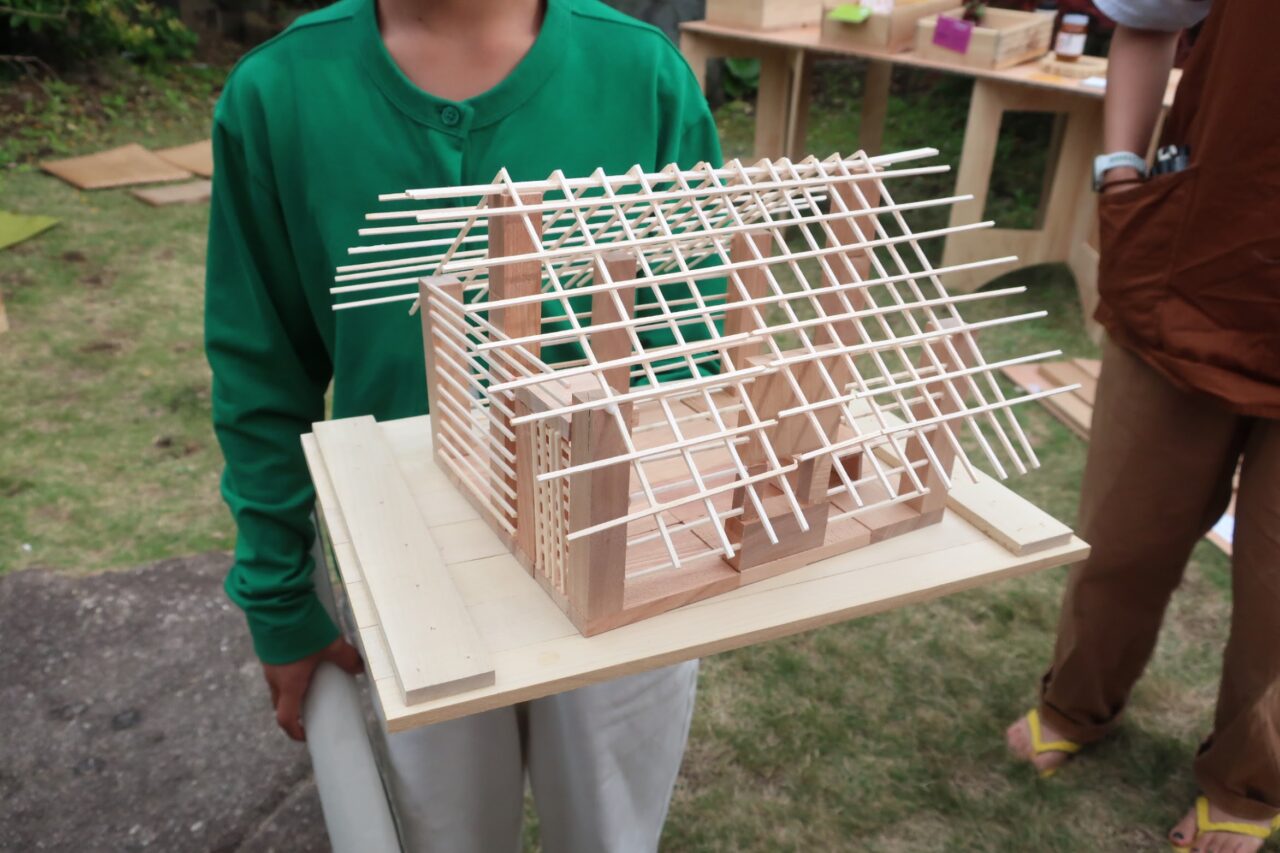 早速、建築現場で出た端材を再利用して作る「積み木ハウス」のワークショップが始まりました。“自分が家を建てるならこんな家に住みたい”を想像しながら作ります。