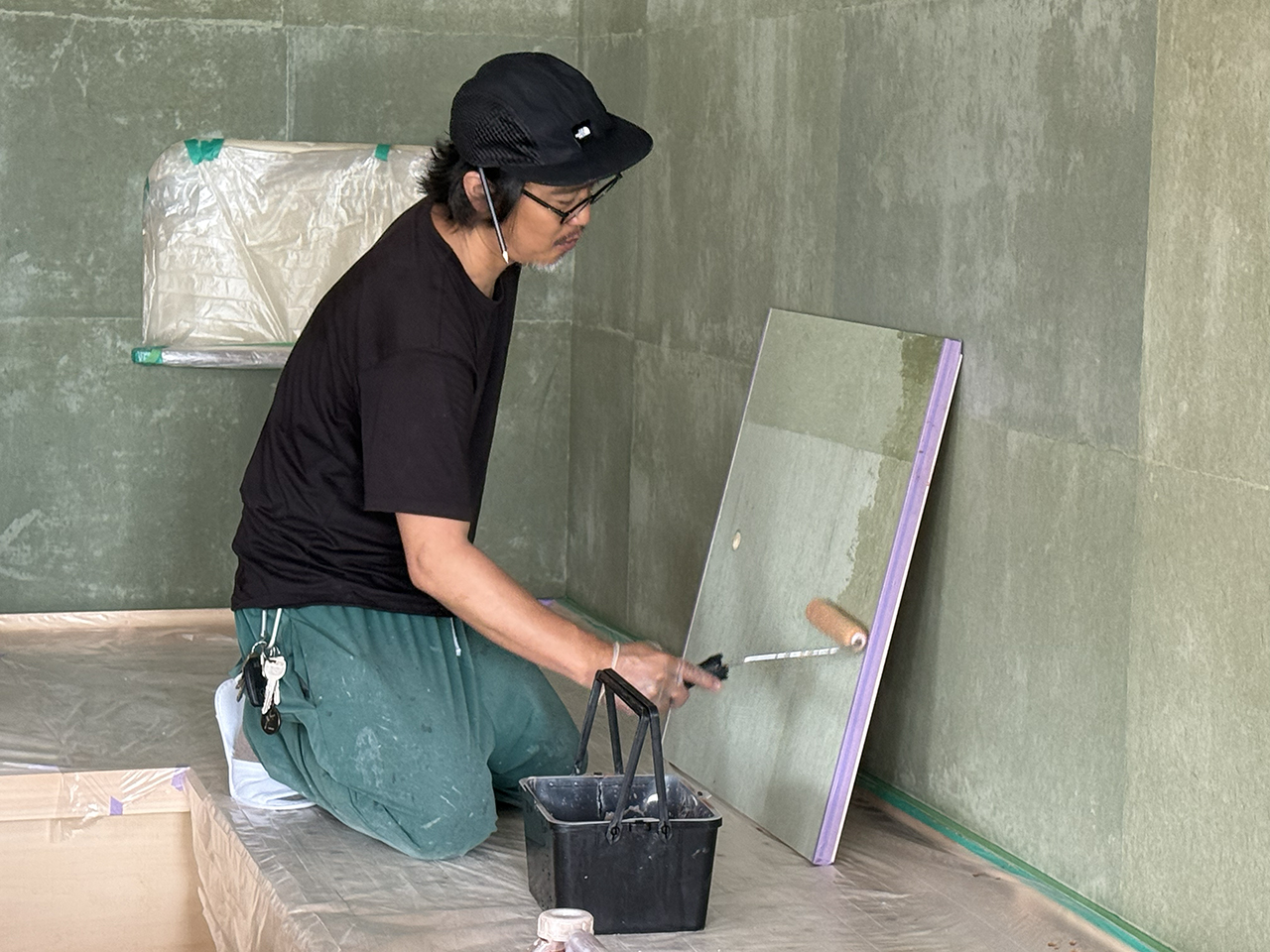 京都府綾部市を拠点に活動する和紙作家ハタノワタルさんによる和紙壁の施工が始まる!とのことで近藤に同行し現場に向かいました。