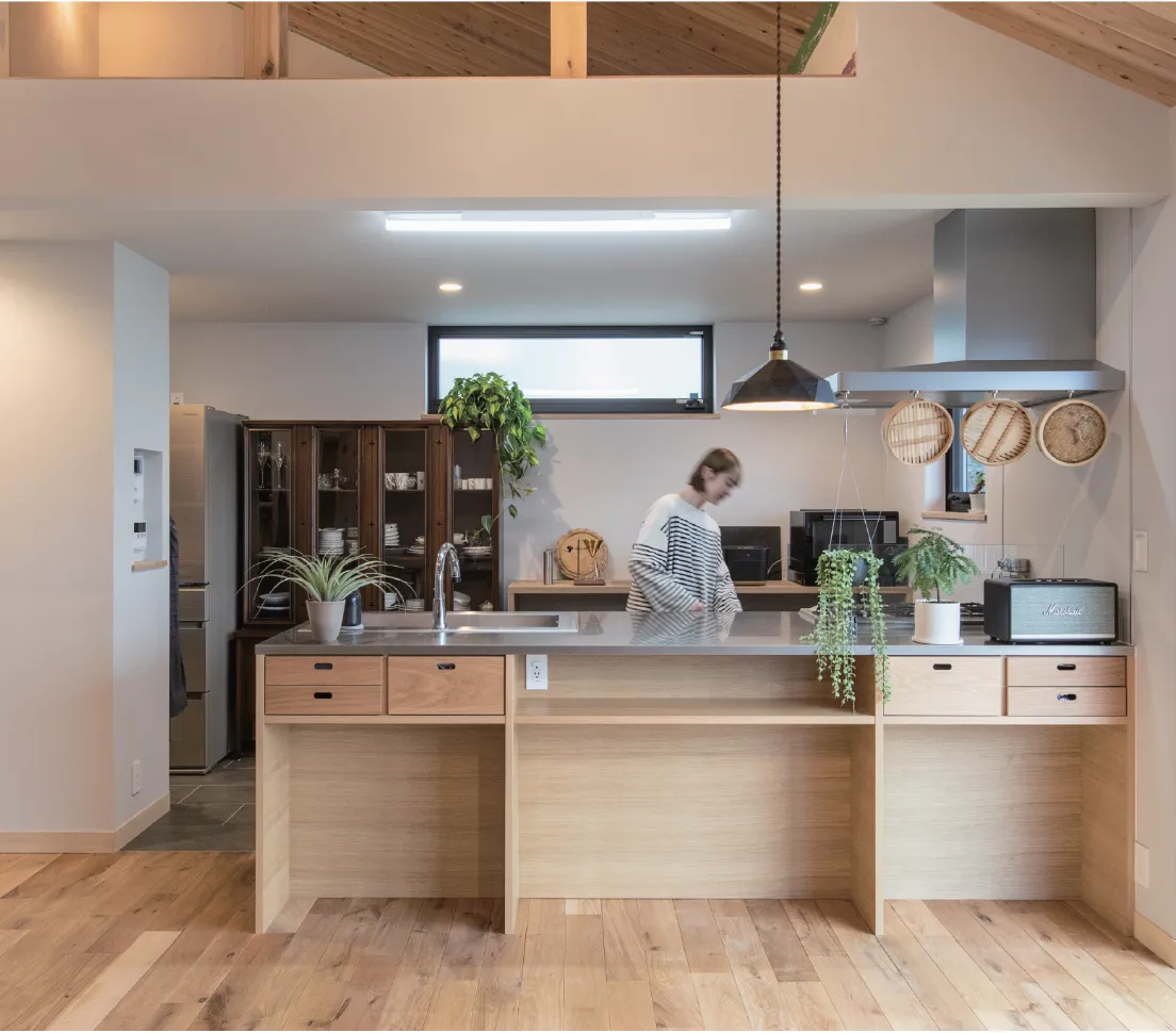 キッチンも手づくりで、世界にひとつだけのものをつくります。毎日使う場所だからこそ、使う人がいちばん使いやすい高さ、広さ、レイアウトをご提案します。素材やデザインもお好みに合わせて選べ、収納もたっぷりつくることができます。自由度は無限大。とことんわがままに、がまんも後悔もない、システムキッチンにはない魅力がいっぱいのキッチンが完成します。もちろん既存の製品と組み合わせることも可能です。自社工房を持っているからこその柔軟な対応力で、ご要望に合わせたキッチンをおつくりします。