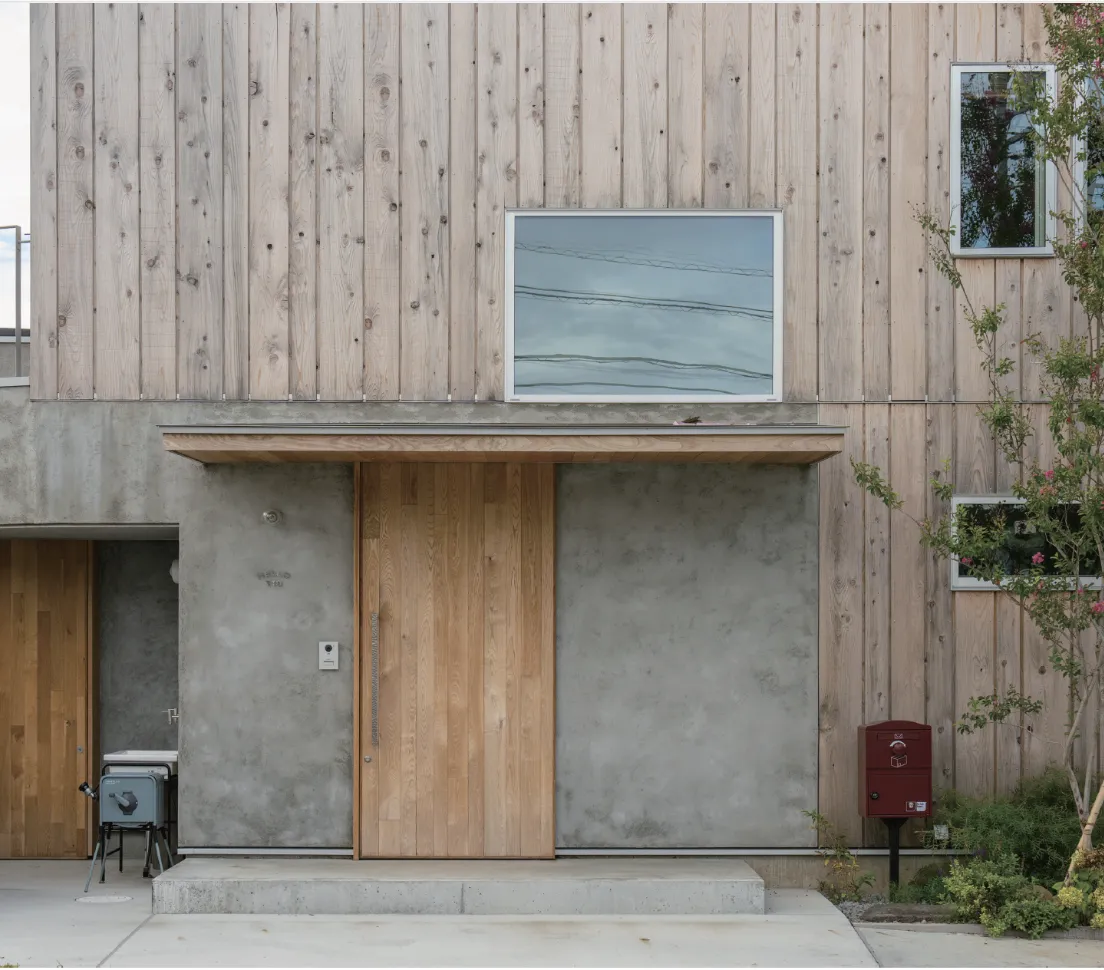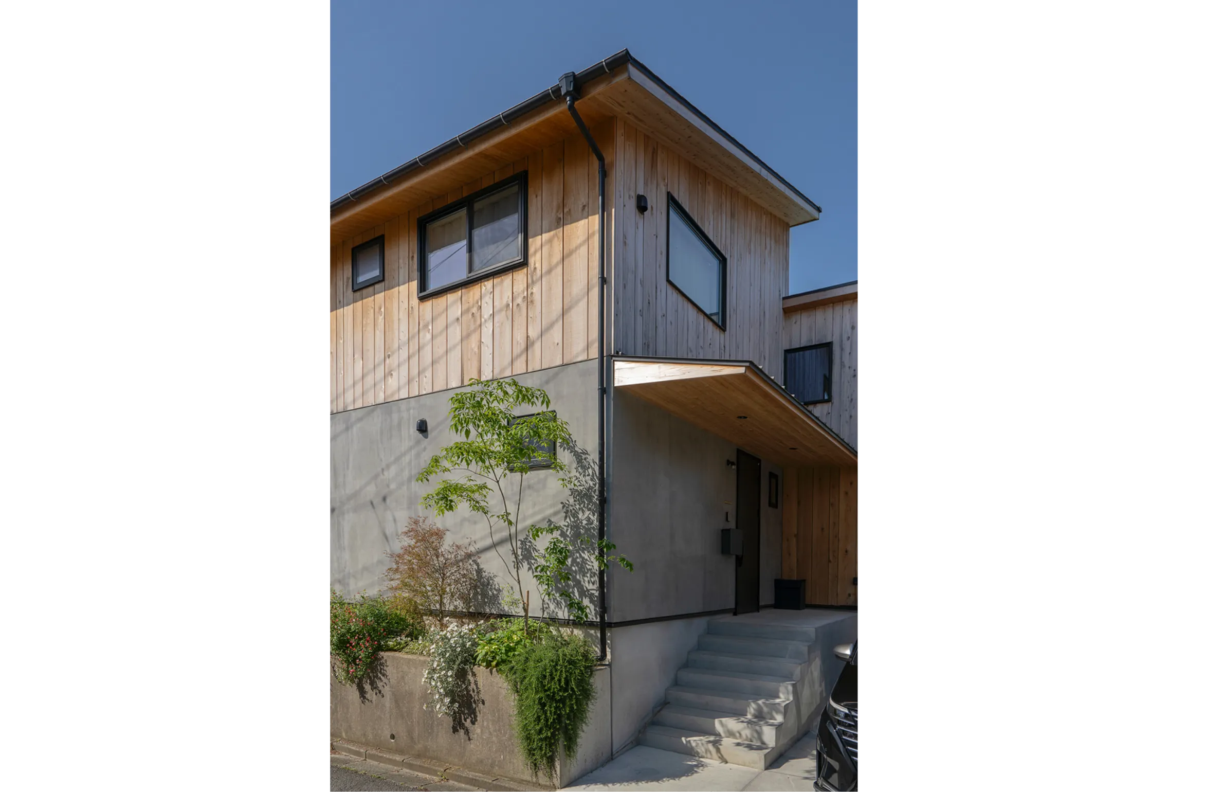 お子様に自然と触れ合う生活をさせたいという思いと、釣り好きなご主人が海に近い環境での暮らしを求め都内から大磯に移住。玄関前の大きな庇は雨に濡れることなく室内に入ることができ、モルタル仕上げの玄関土間にはキャンプなどのアウトドアの道具を収納する造作棚に加え、釣りのロッドの収納用に有孔ボードも設置。外壁には北海道産の無垢杉材とモルタルのコンビネーションを採用。