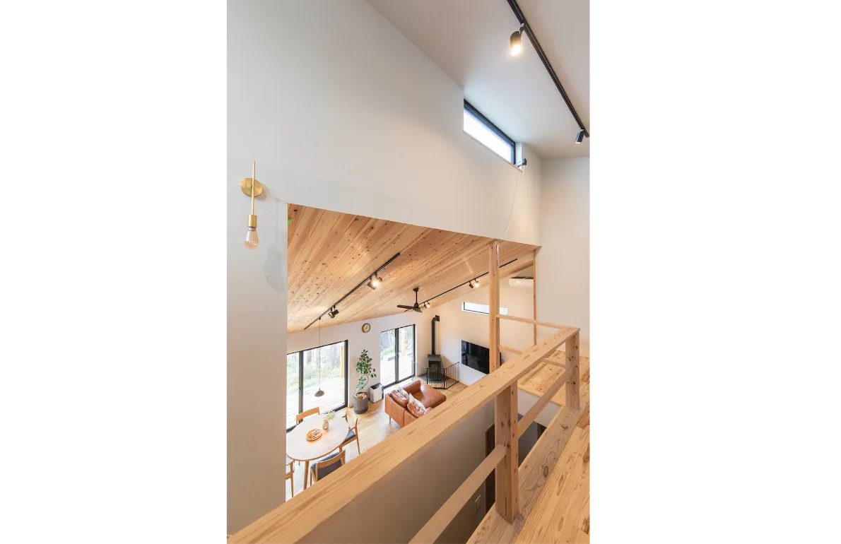 気積の大きい吹き抜けの大きなリビングを中心に、どこにいても家族の気配を感じられるような間仕切りの少ない空間を実現。お子様を部屋に籠らせたくないというご夫婦の思いから、2階の子供部屋の壁を天井までつくらずオープンにして廊下やリビングと緩やかに繋げ、勾配天井からの風の流れとハイサイドからの光も上手く取り入れる設計にしました。