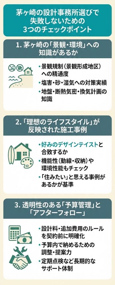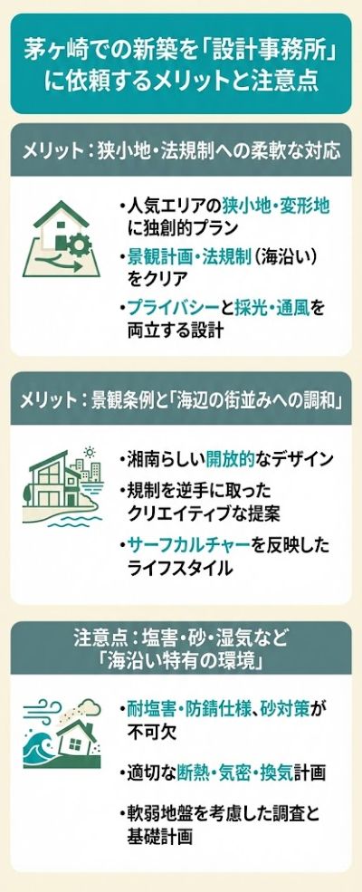 特に茅ヶ崎という海沿いの環境では、設計事務所ならではの強みが発揮される一方で、押さえるべきポイントもあります。