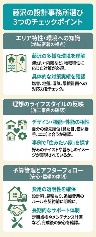 特に藤沢という多様な環境を持つ地域では、設計事務所ならではの強みが発揮される一方で、押さえるべきポイントもあります。