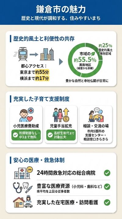 新築一戸建てを検討される方に向けて、住みやすさ、子育て・教育環境、医療環境の3つの側面から鎌倉市の魅力をご紹介します。