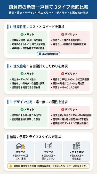 鎌倉市での新築一戸建て購入では、予算とライフスタイルによって最適な住宅タイプが決まります。