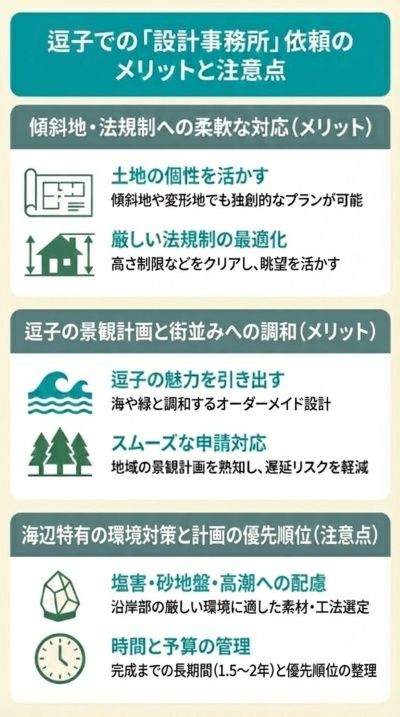 特に逗子という海辺の環境では、設計事務所ならではの強みが発揮される一方で、押さえるべきポイントもあります。
