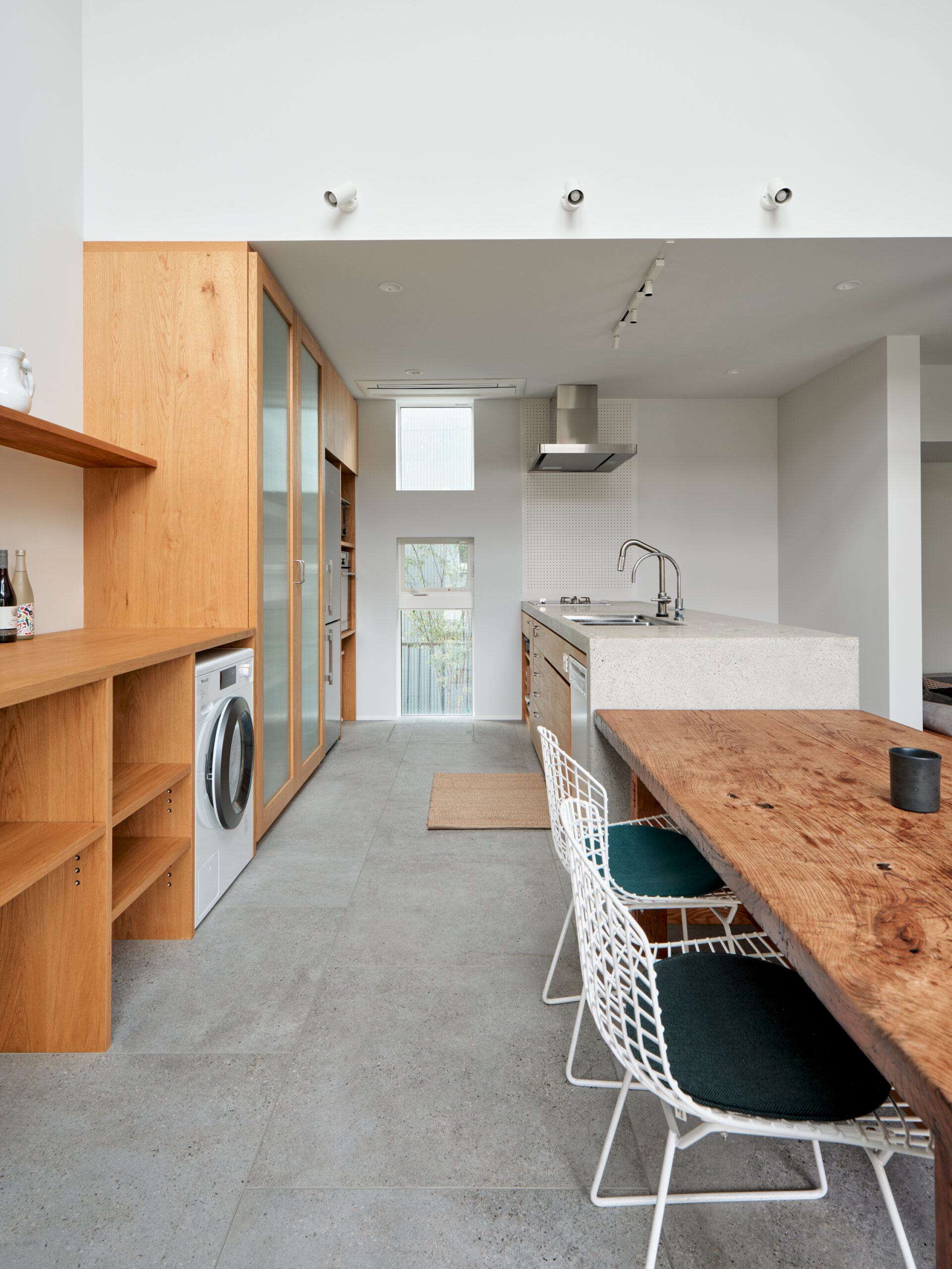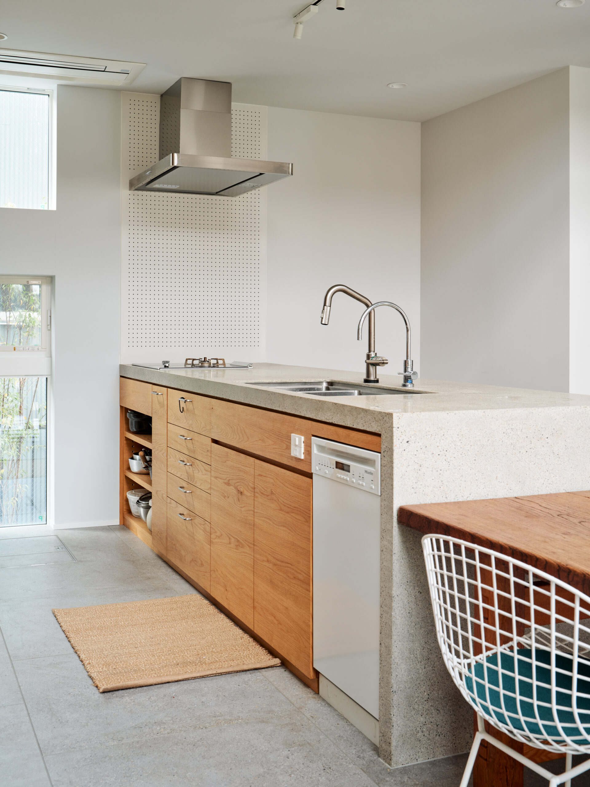 1階は、お風呂、洗面、トイレ以外の間仕切りを無くして大きなワンルームのような間取りにし、ダイニングの上部の吹き抜けに面した2階の引き込み戸を開ければ1階にいる人達ともコミュニケーションがとれ、どこに居てもみんなで会話が弾むような環境が実現。3mを超える造作のキッチンの天板と側面は、人造石研ぎ出し左官仕上げで設えました。大きなバルコニーにはご主人こだわりの檜のサウナと水風呂が設置され、ここに集まったみんなは外でバーベキューをしたり、ロウリュウサウナ&水風呂&日光浴で整ったり、それぞれが自由に過ごし方を楽しんでいるそう。